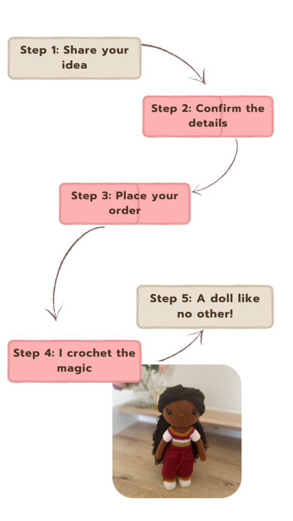 These dolls are for people who want more than ‘add to cart.’ They’re for gift-givers, memory-keepers, and anyone who believes the best things are made slowly and with intention. I create custom crochet dolls made to order. Because each doll starts with your idea, no two are ever the same. As a result, every finished piece is truly one of a kind.